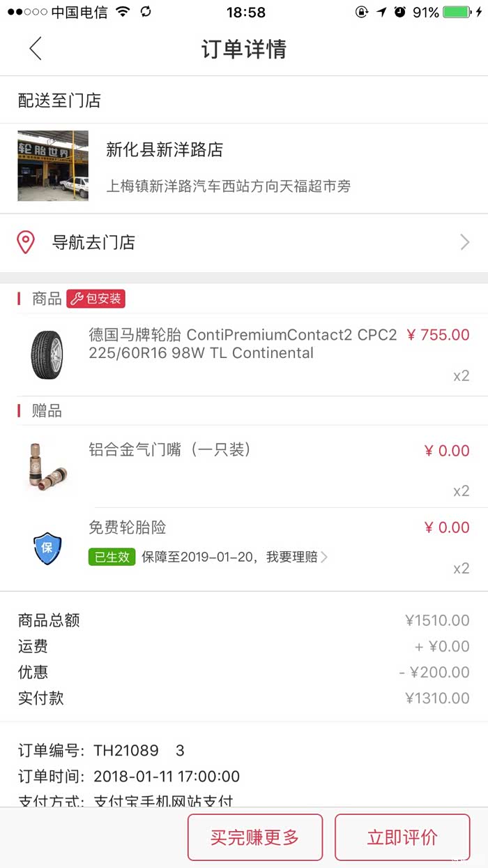 天天看途虎有没有货,发现一直都是缺货预定状态,最后拖到11号终于忍不住了下单买了2个。途虎都是有安装服务的,不过我们小县城只有一家,没得选择,直接选择到店安装,途虎安装及购买的话还能送1年的轮胎险。