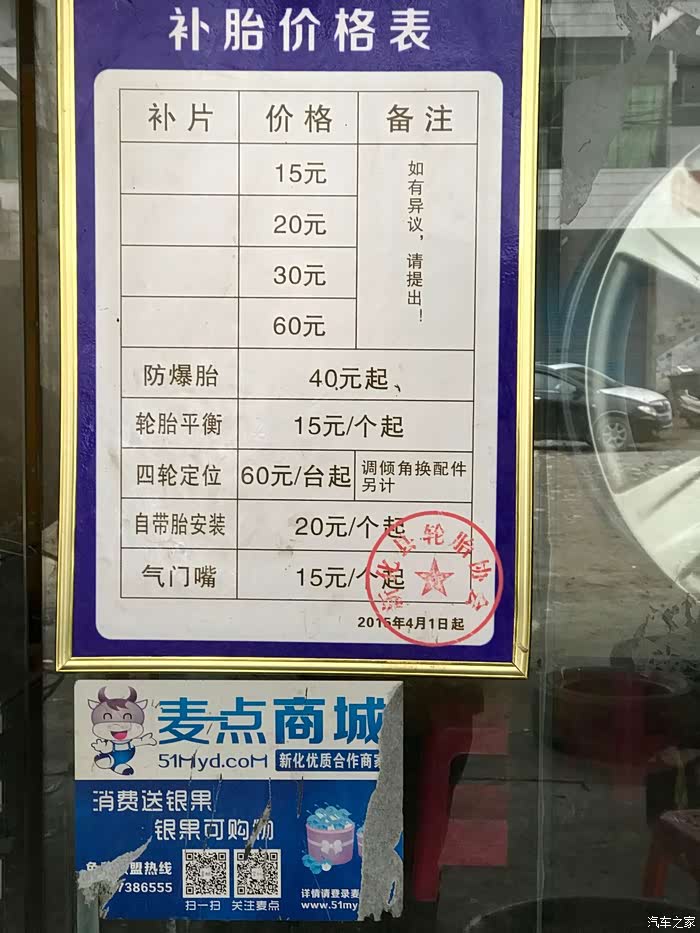 店里贴的价格表,途虎安装及购买的话安装是不要钱的