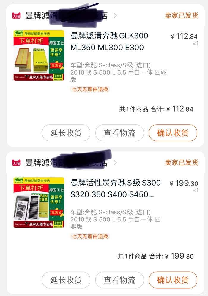 空调格是2006-202款S级通用的,发动机空气格是M273发动机通用的,没有想到到货还挺快。
