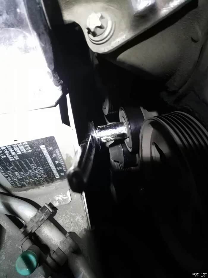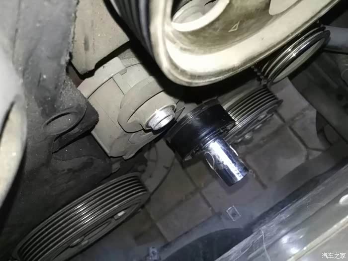 开始了,先把张紧松了,涨紧轮上面螺丝是15mm的套筒,用梅花也行,梅花太短,反正我搬不动,力不够,劲大的狮友可以试试,逆时针往车身方向用力,涨紧轮起来一个角度,一手扳扳手,这时可以用另一个手摘掉皮带,在这我不能照相了,皮带摘掉后,放回涨紧轮,顺时针再拧松这个螺丝,(这个螺丝是左旋的),有点劲儿,得用力