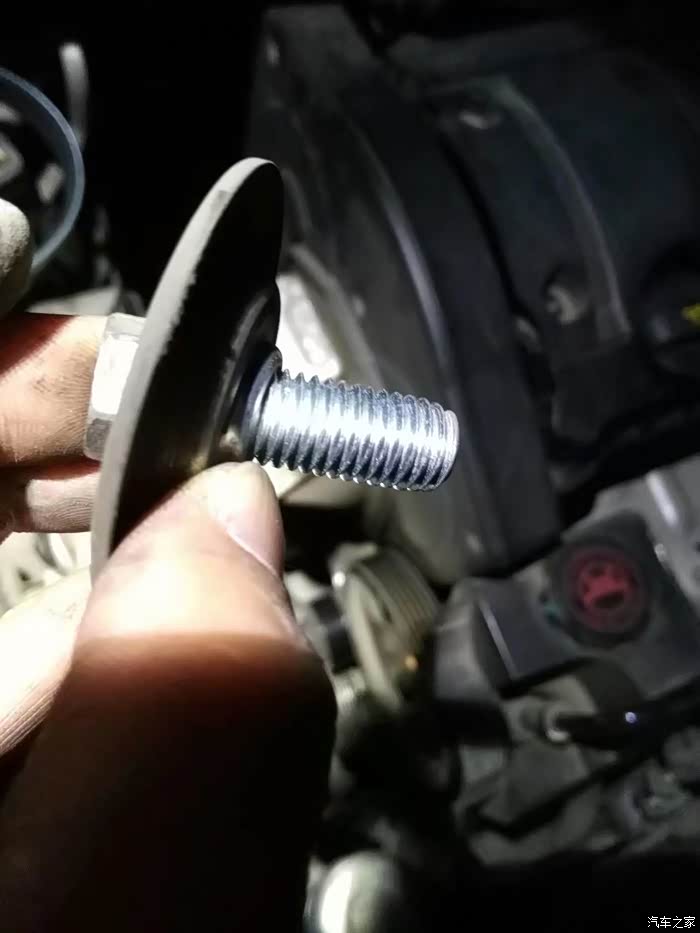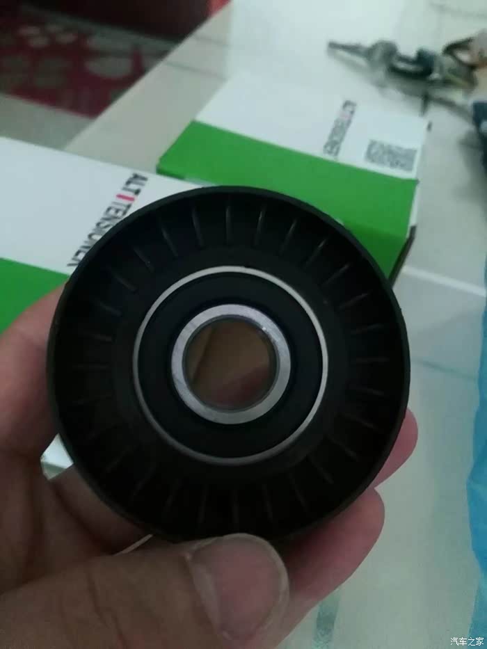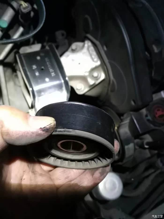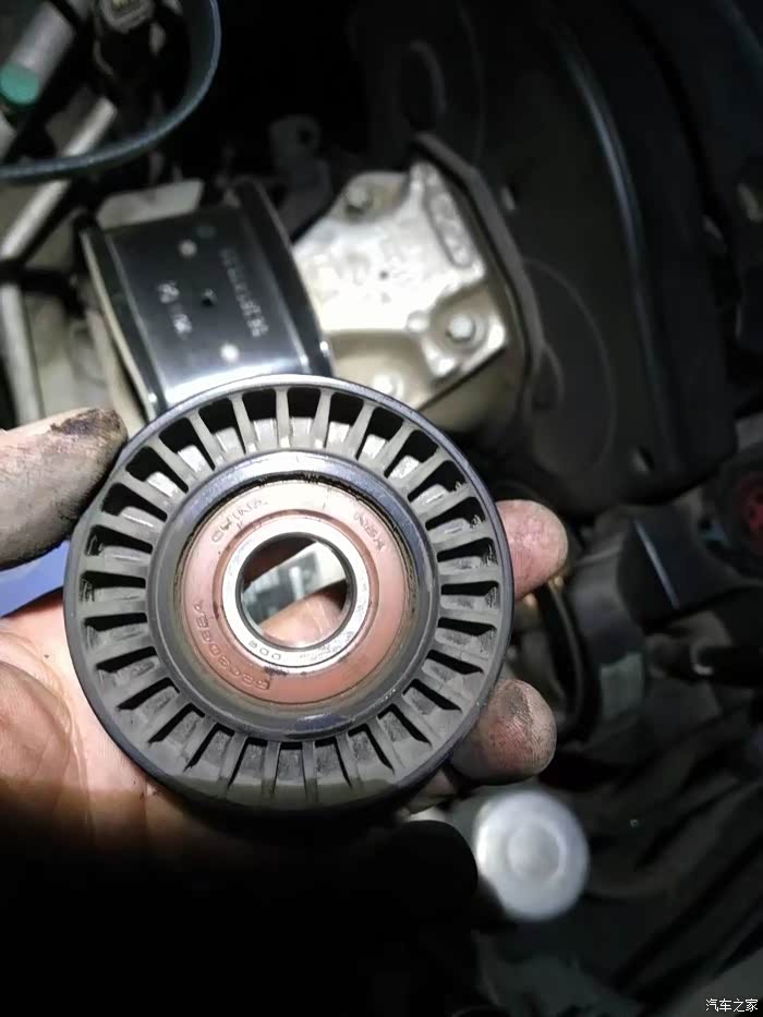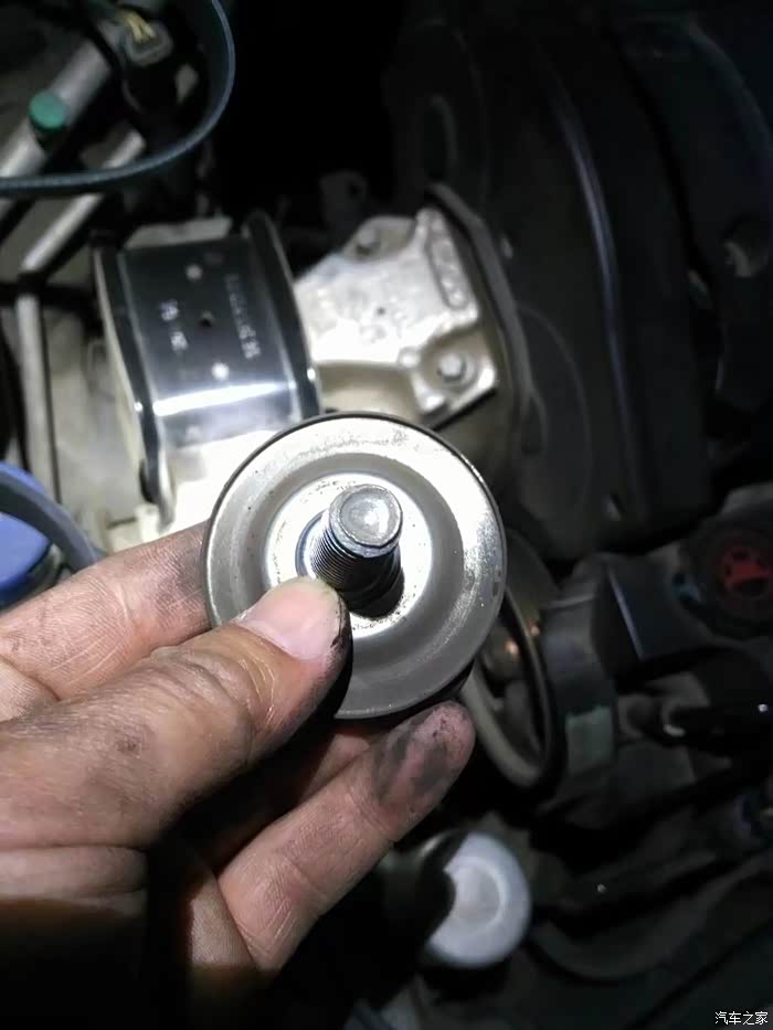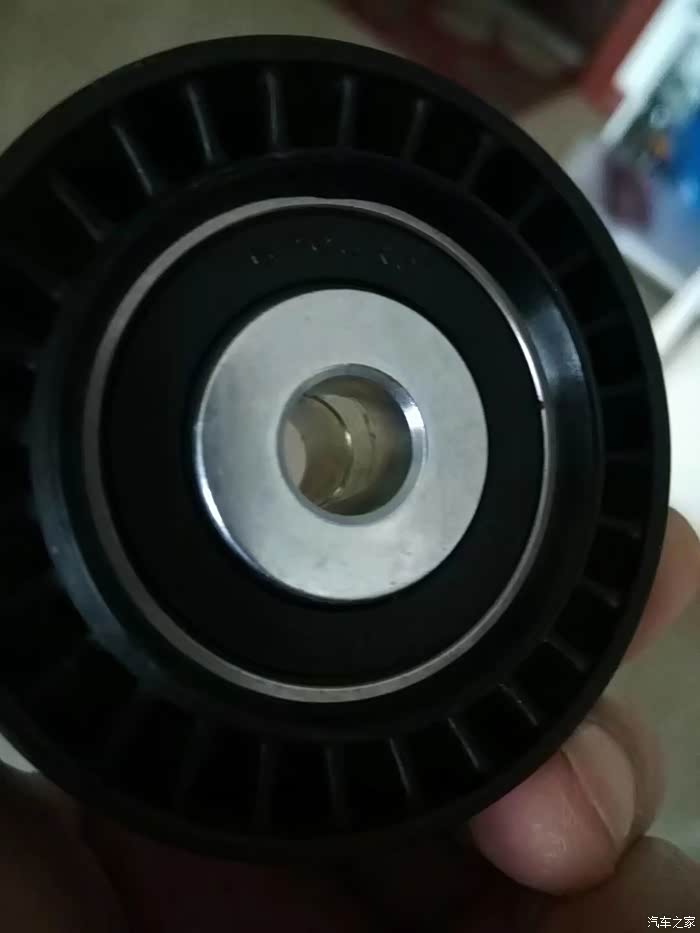 涨紧轮回装很简单,直接逆时针拧上就行了,回装皮带过程,不能照相了,一手扳涨紧轮,一手上皮带,要是有三只手就好了!有人说涨紧轮搬到位有个定位销插上,就可以不用板着了,可惜那个定位孔在车下面不好插,还不如一手扳,一手上皮带省事呢。上好皮带,打火,问题来了,之前由于惰轮和涨紧轮磨出台阶,皮带向外跑偏。