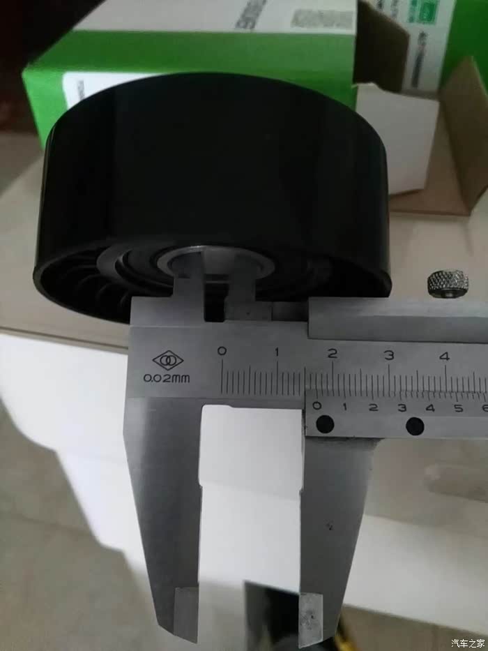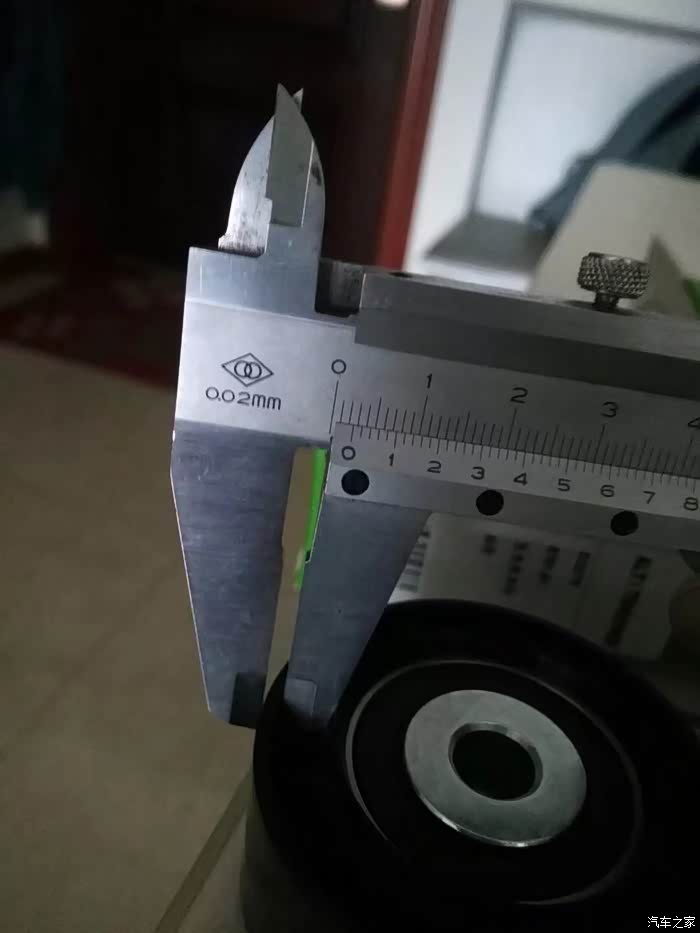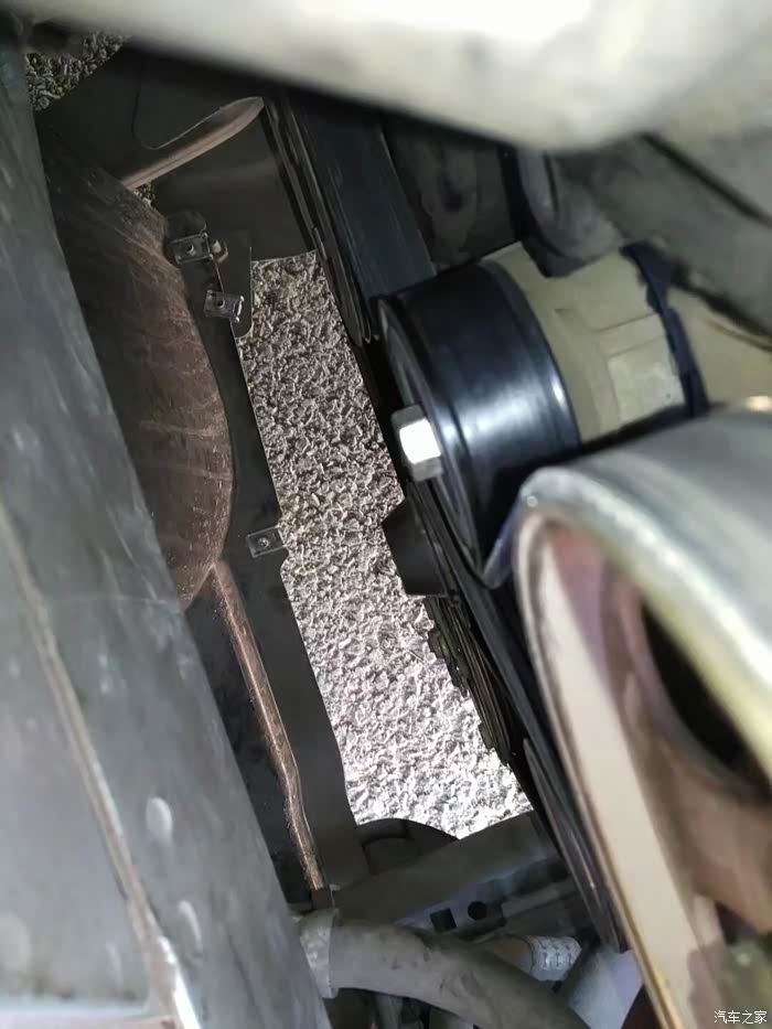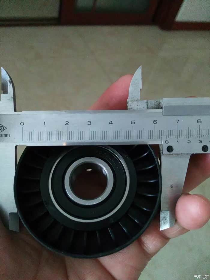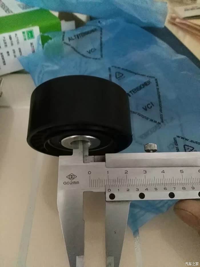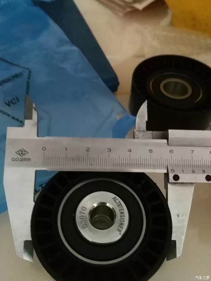 涨紧轮回装很简单,直接逆时针拧上就行了,回装皮带过程,不能照相了,一手扳涨紧轮,一手上皮带,要是有三只手就好了!有人说涨紧轮搬到位有个定位销插上,就可以不用板着了,可惜那个定位孔在车下面不好插,还不如一手扳,一手上皮带省事呢。上好皮带,打火,问题来了,之前由于惰轮和涨紧轮磨出台阶,皮带向外跑偏。