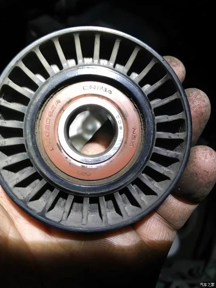 本想把轴承防尘盖打开加点油,可是涨紧轮转动非常灵活,无异响,也就没加油,隋轮状况也很好,也就没拆,对了,隋轮外面有个塑料罩,用螺丝刀撬一下就掉,螺丝是16MM的,记住隋轮是右旋螺丝!!!!!要是狮友在换皮带时需要给轴承加油,这里给大家提点建议参考一下:用小的一字螺丝刀打开防尘盖,最好两面都打开,用清洗剂(小罐喷的那种,755啥的)清洗,注意要用高温润滑脂,锂基脂,钠基脂啥的,而且千万要少放,每个珠粒上面有点就行,加多了如果密封很严反而轴承自身阻力增大,密封不严甩的到处都是。密封盖拆掉后肯定封不严,所以我是想用玻璃胶封一下,不过得放上几十分钟,等胶干了再上
