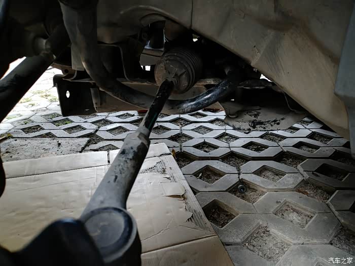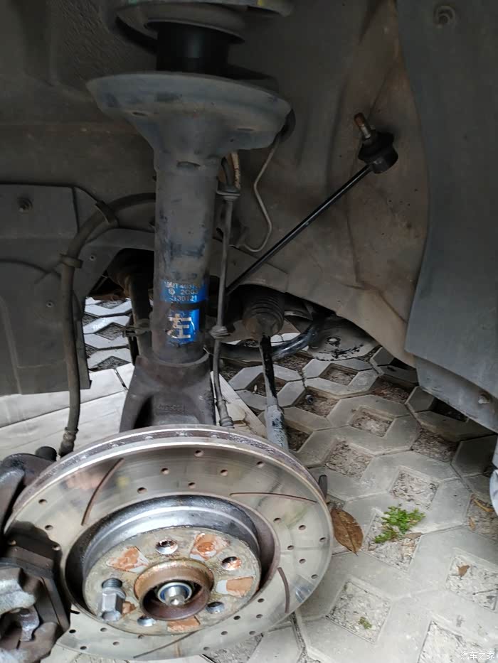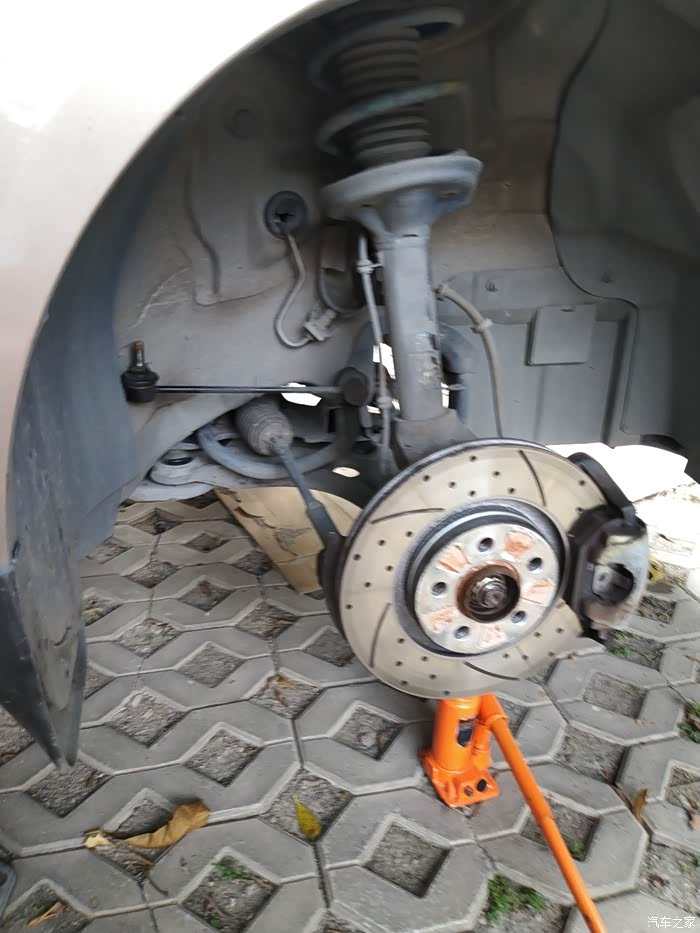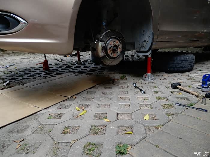 筹备工作做完了,可以开搞,把前轮都拆掉,用安全支架架起来,垫上纸皮,一会要钻车底松衬套螺丝