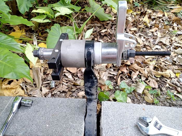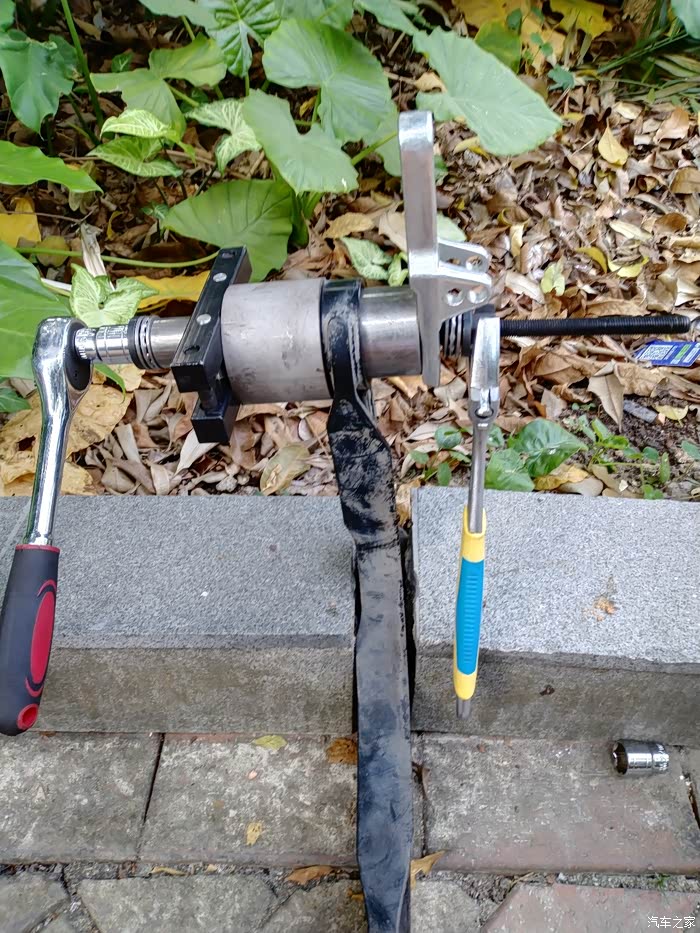 把三角臂嵌在路边花基裂缝里固定,用丝杆工具把旧衬套压出来,一边用开口扳手固定,一边棘轮拧动,工具是东拼西凑的,包括之前换外球笼的球头起拨器和球笼拉马的部分零件