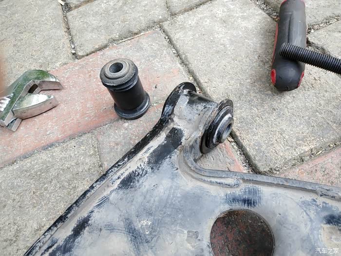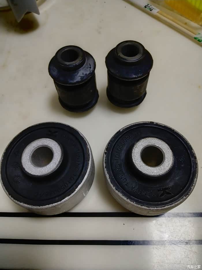 ,本人开车没那么生猛,见坑或沙井盖都绕着走,所以车子跑了17万公里衬套也只是有些裂纹,没有完全裂开,旁边是准备换上的新实心衬套