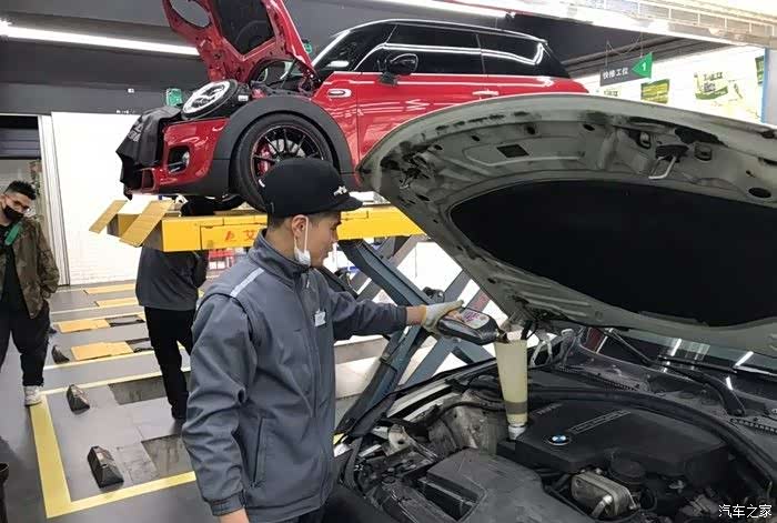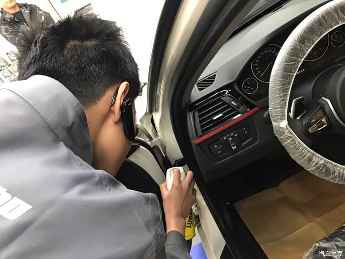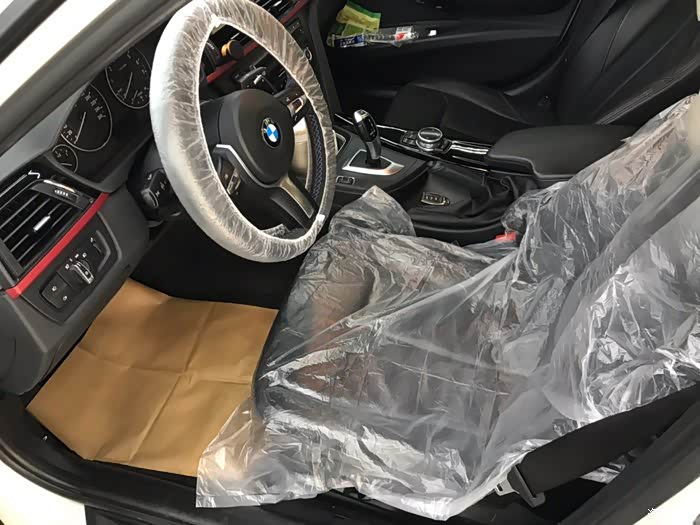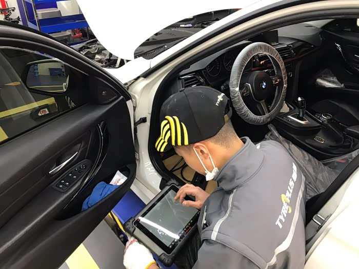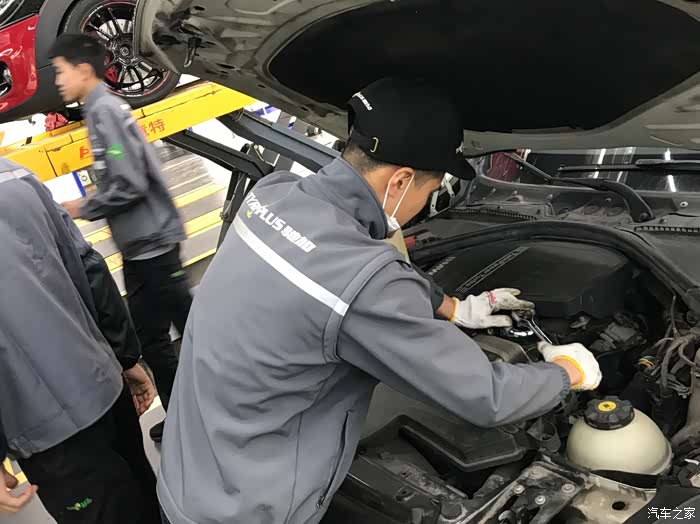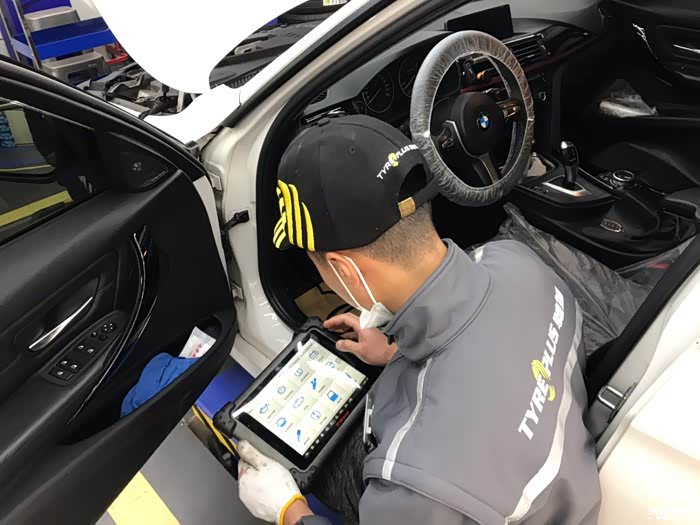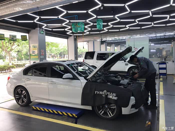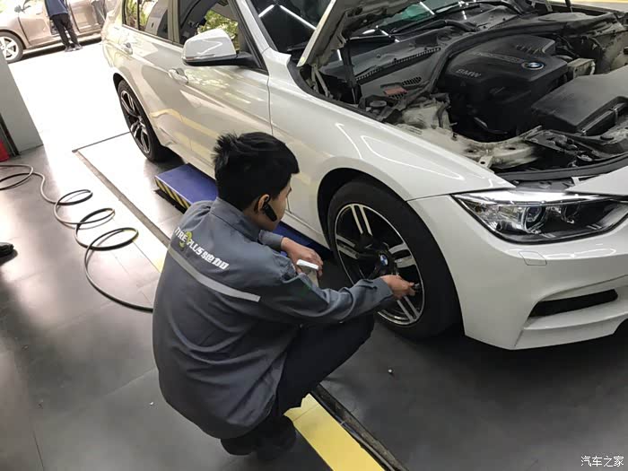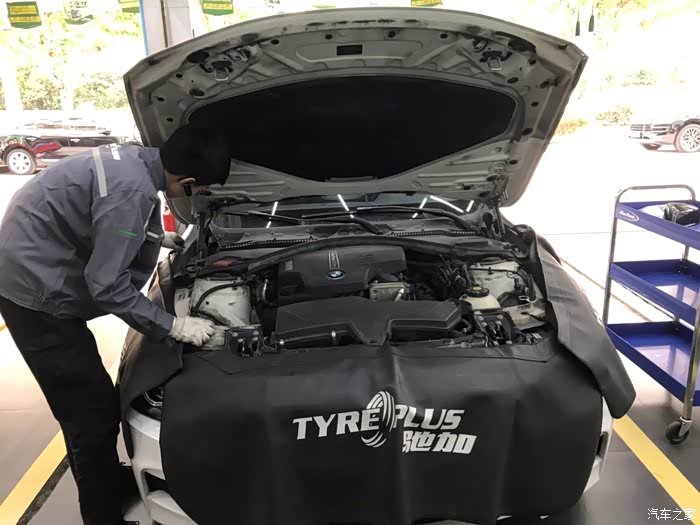 停进工位之后开始上保护套,正式保养之前先做一些常规的检测,外观、胎压什么的。