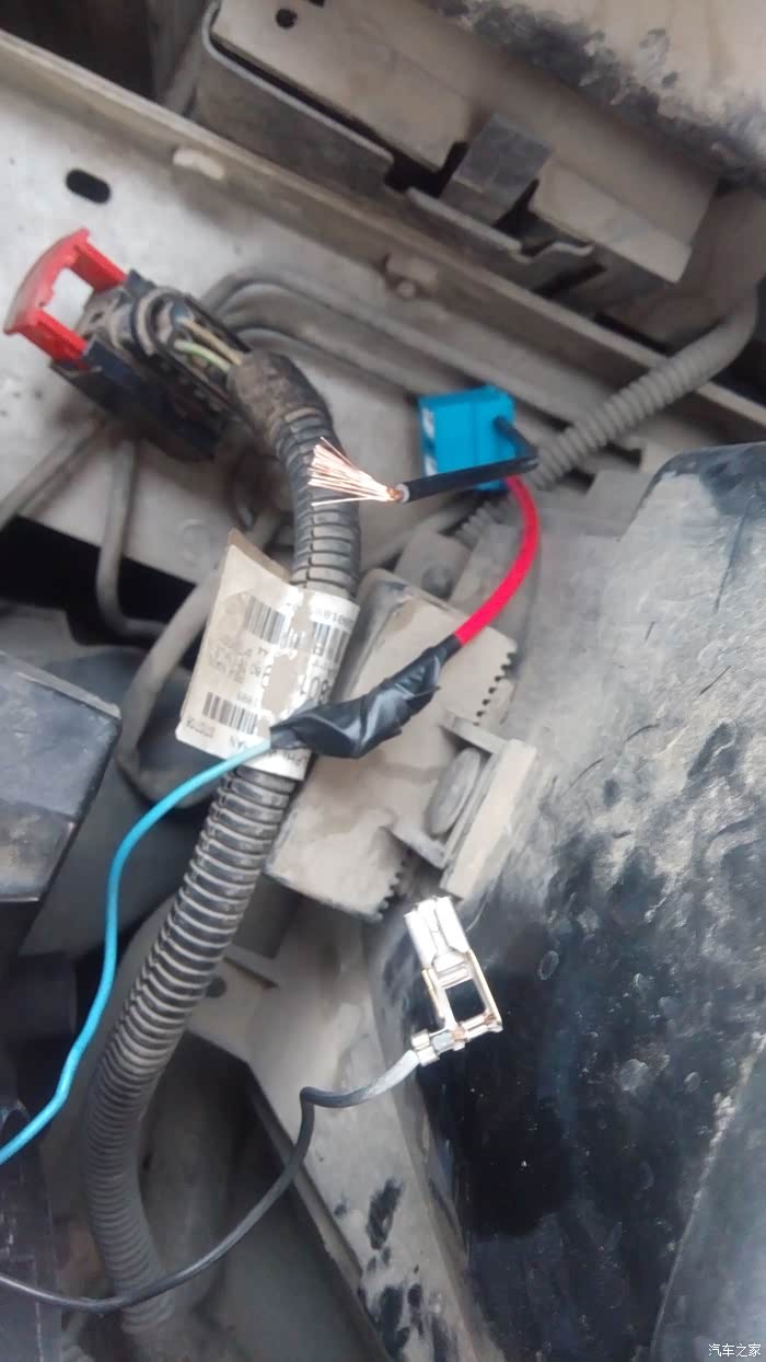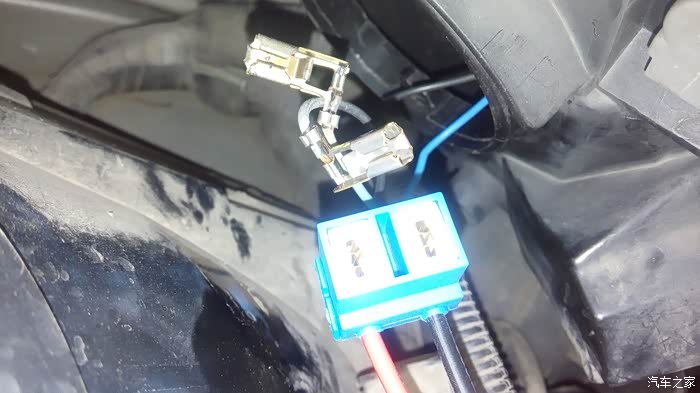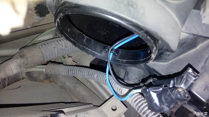 车头朝右,红色接口为左前大灯总成的供电接口,远处的圆形黑色胶盖里面是近光灯及接上的灯座,打开就可以将近光灯下下来。