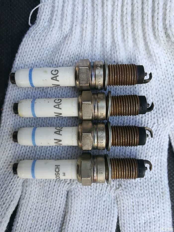 四个旧火花塞全家福,德国制造。电极烧灼挺明显的,间隙也大了,烧的和想象中差不多,应该算是超期服役了,谁让他是原车的了呢。