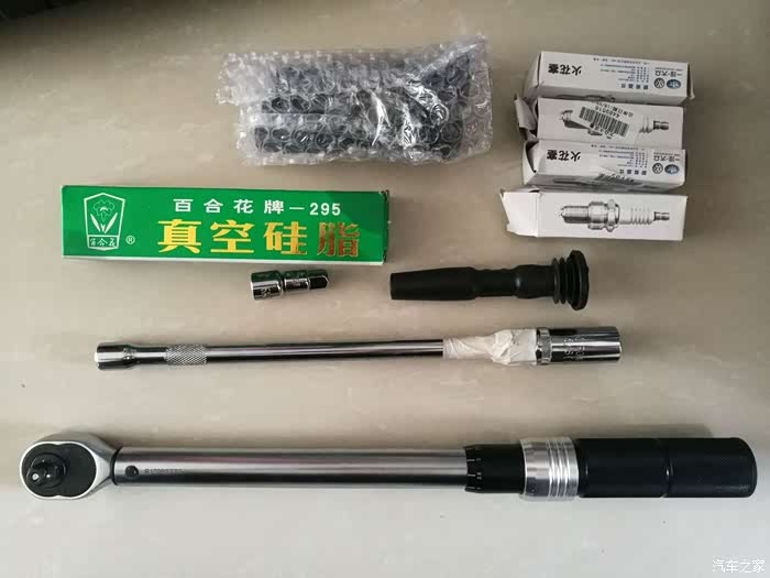 火花塞到手的价格一只不到30元。自己淘了个10-60NM的中飞扭力扳手(配了火花塞套筒和中飞小飞的变头),为了安全又淘了高压绝缘硅脂和胶套(害怕拔断点火线圈胶套),等着东西陆续都到齐了,连着下了好几天雨,今天端午节的前一天终于放晴了,看看湿度表60%问题不大,开始动手。