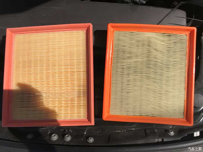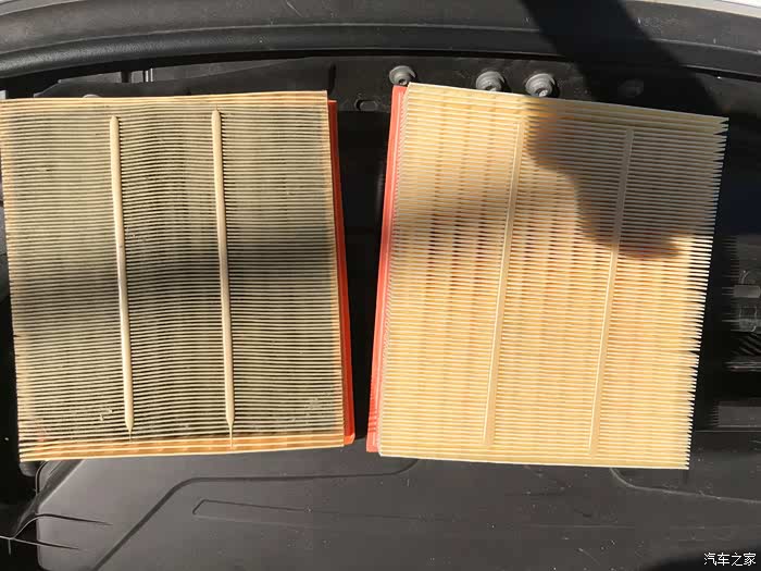 这是拿出后,新旧滤清器正面对比,(左)旧的,(右)新的,看正面并不是很直观,但是还是非常的脏。可见现在空气有多不好。下面是反面对比。