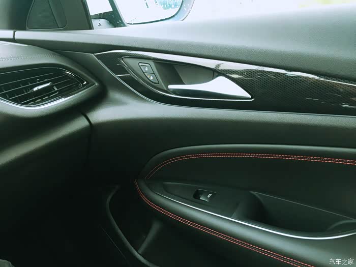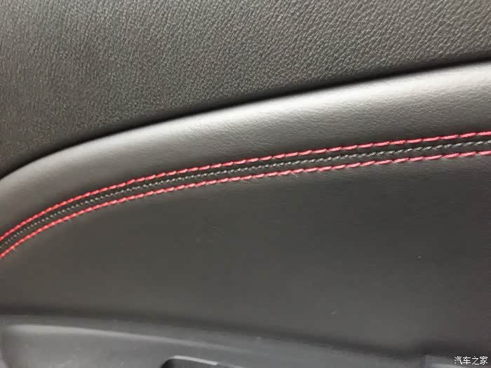 车门扶手边上的饰板用的红色双缝线设计,看起来挺有档次,不过个人觉得有点俗,换成白色缝线可能会更洋气些,哈哈。