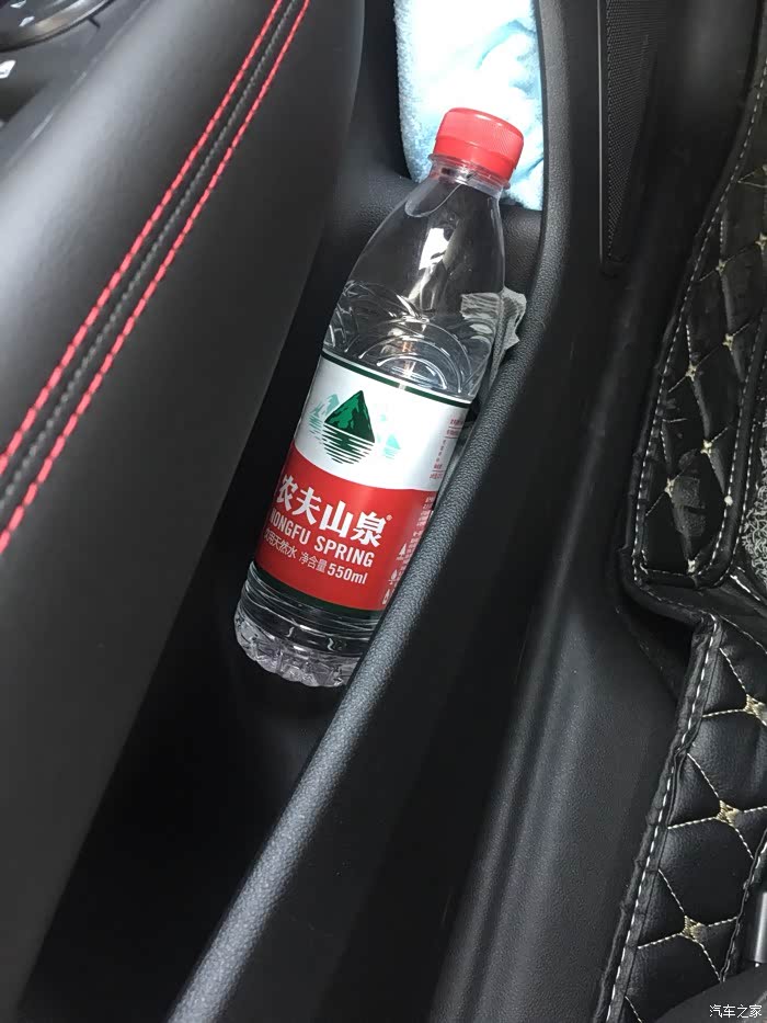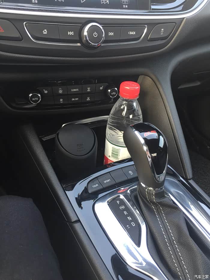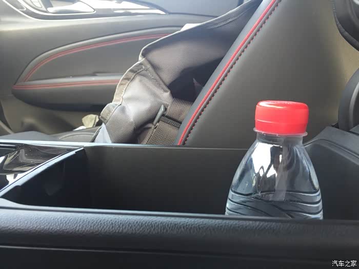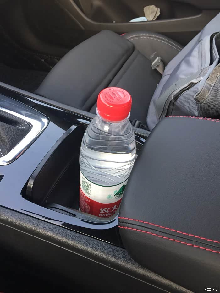 档把前的水杯架,图中可以看到,放一瓶矿泉水就挡住了空调温度调节按钮,放两瓶的话,那一排按钮都甭用了,开车时想调一下空调温度都做不到,有待改善。