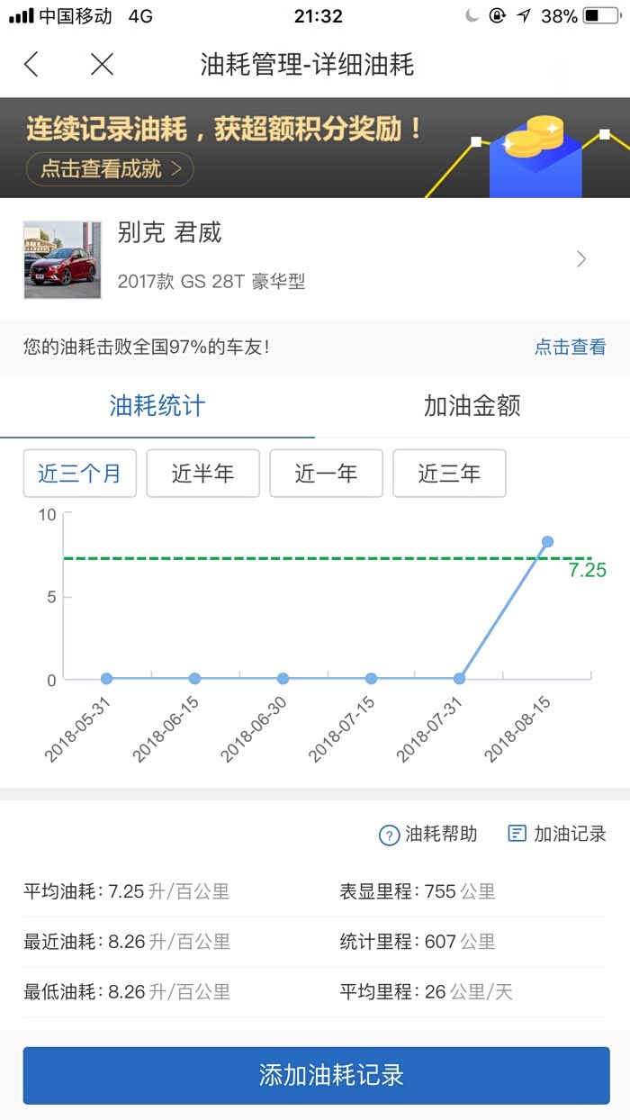 我用的汽车之家的油耗记录,它的计算方式是两次加油且都加满油箱的情况下用第二次加油的量除以两次加油之间的里程数,这种计算方式应该还是挺准确的。这箱油的综合油耗为8.26升/百公里,后续应该还可以降低。