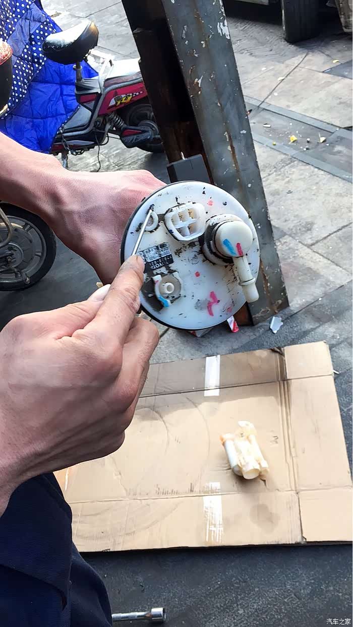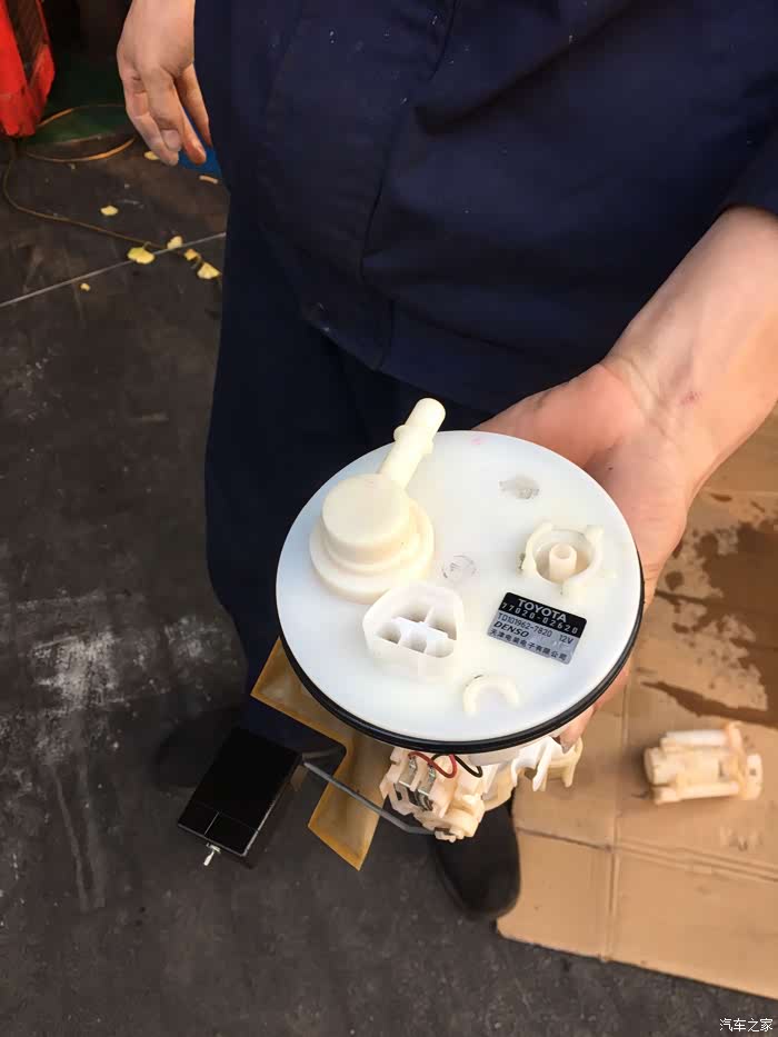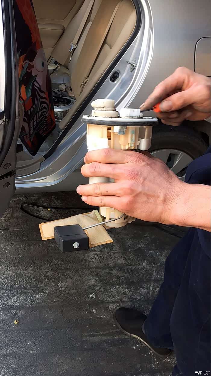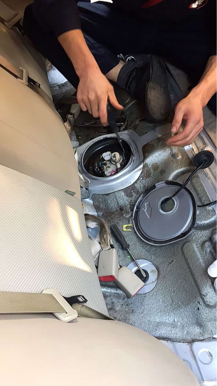 打开铁盖再拔掉管子、线束,原装的滤清器就取出来了,取出来后,油箱里的汽油清澈可见,整个车厢弥漫着汽油味