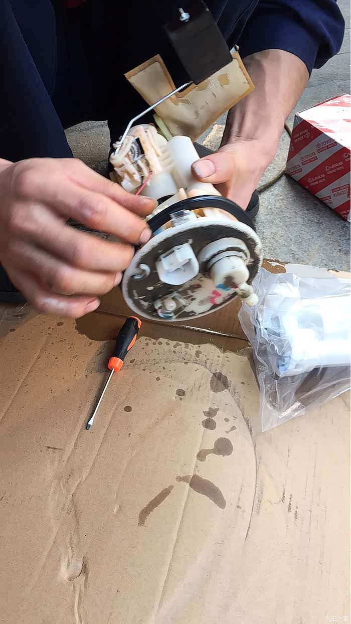 将拆下来的油浮子,汽油泵 还有一些小零件,装在新的滤清器上。师傅再帮我清洁表面