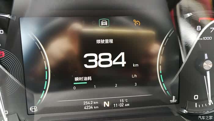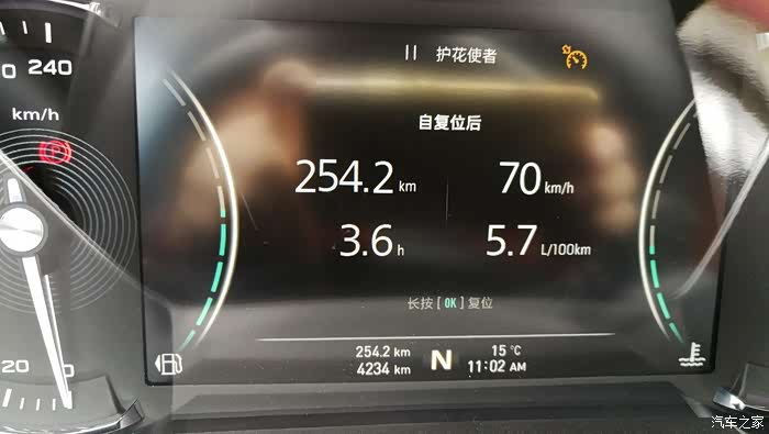 中午11点零2分的时候,行驶了254.2公里,均速显示70公里/小时,续驶里程384公里,油耗5.7个↓↓↓。