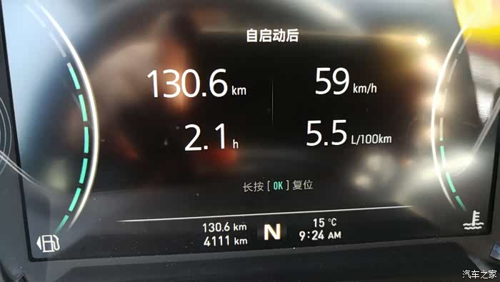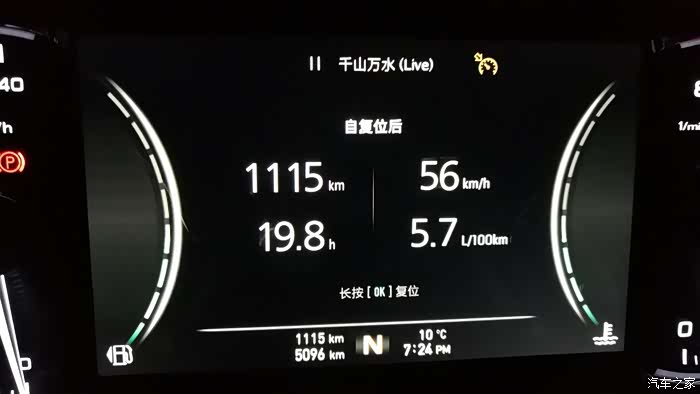 今天因为玩得太嗨,直到晚上7点24才有记录,跑到1115公里的时候,显示续驶里程307公里,均速56公里/小时,油耗5.7个↓↓↓