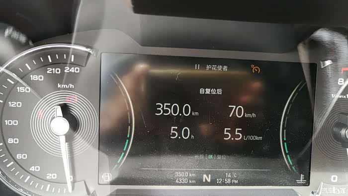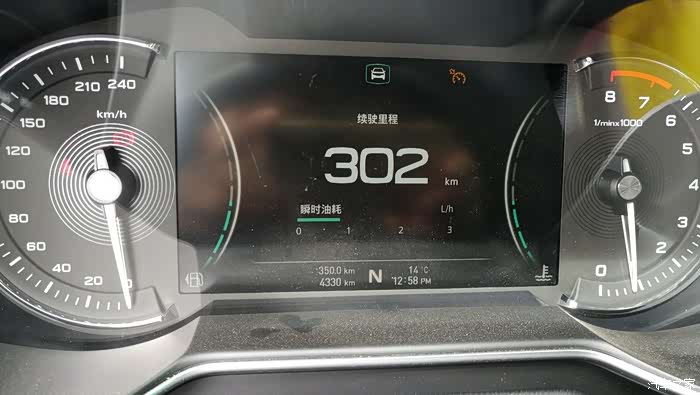 到正午12点58分的时候显示跑了350公里,续驶里程302公里,均速70公里/小时,油耗5.5个↓↓↓