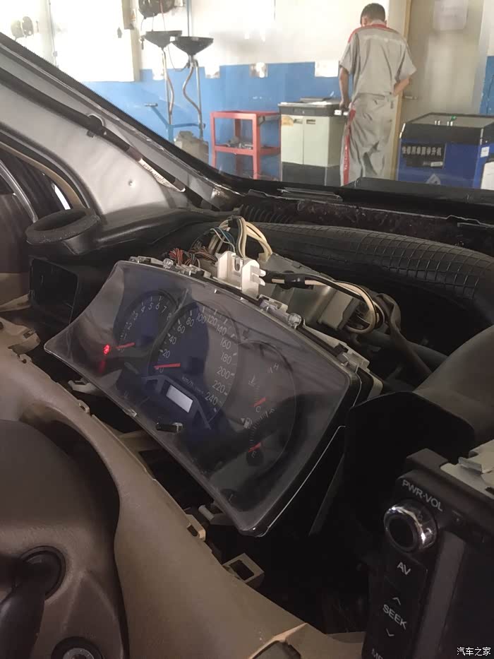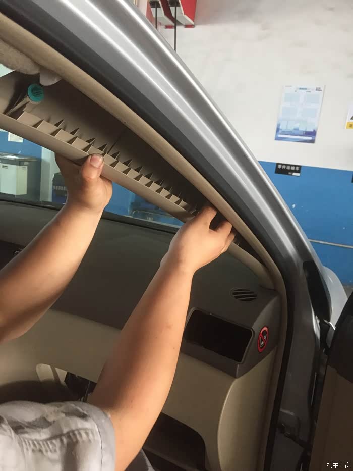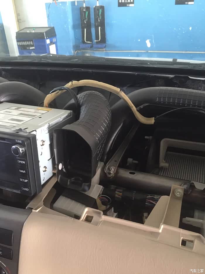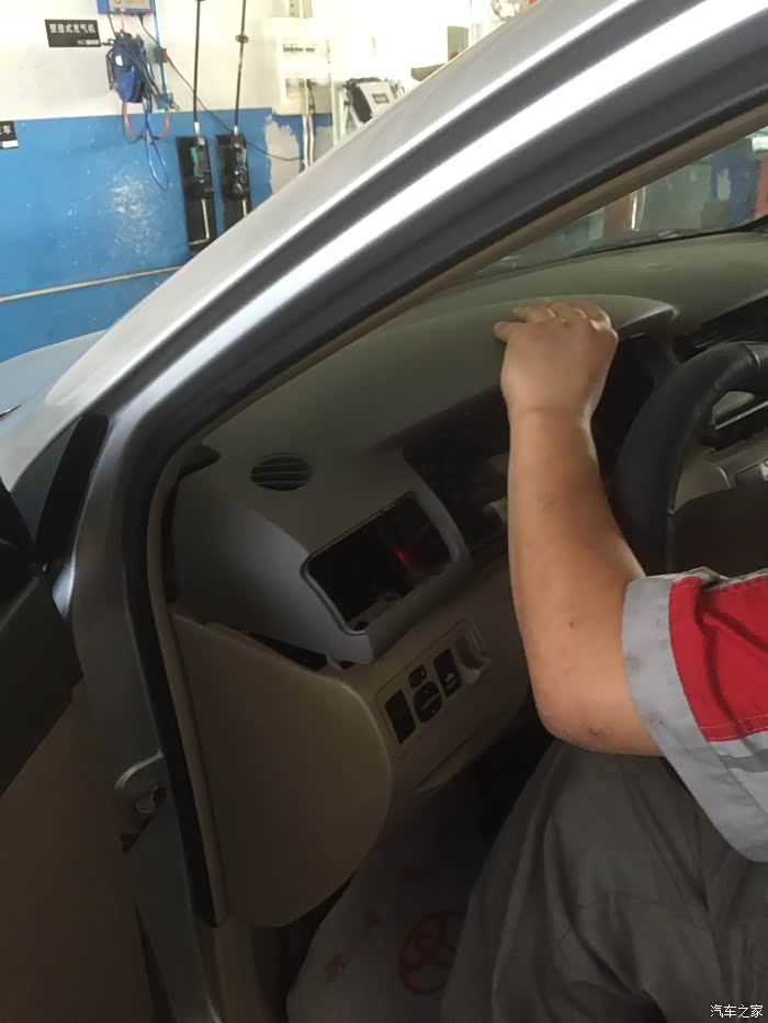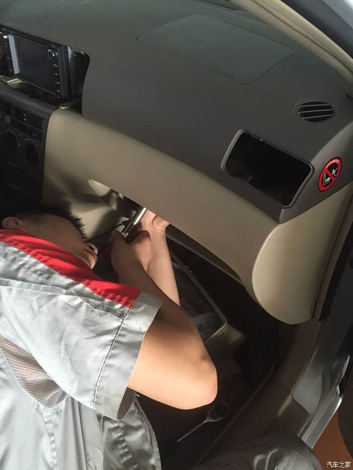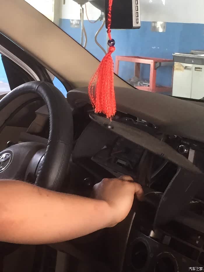 4S的小哥动作真快(两个小哥一起干,怪不得这么快),看着车开进维修车间,在外面和售后服务人员说了几句话,等我进去,就已经拆成这样了,中控台盖板马上就要拿下来了,很遗憾没有看到拆卸了几颗螺丝,不过看他们后面安装,应该是3到4颗螺丝。