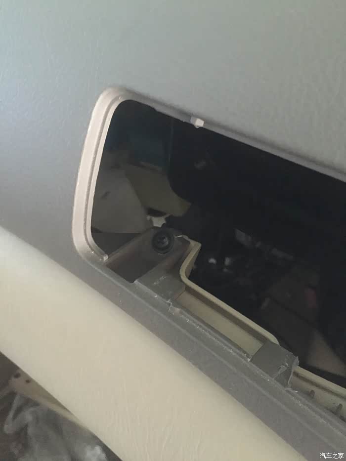 大家看仪表盘上面中间位置的那个白色零件,应该是和盖板有螺丝固定。安装时4S小哥在这个地方也有上螺丝的动作。