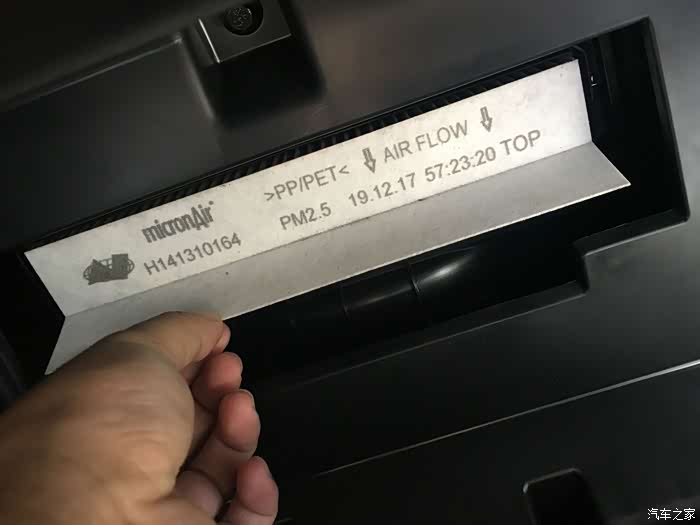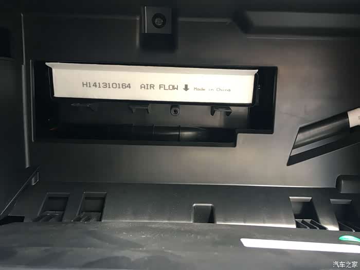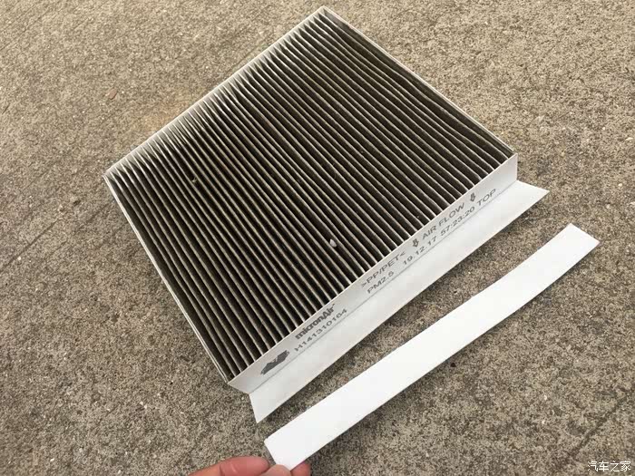 档板拿出来后,看到白色的空调滤芯侧面带手柄,这会可以看到侧面显示空调滤芯箭头朝向下方(这个留意下),顺带手柄可以轻松将原车旧空调滤芯拉出来了