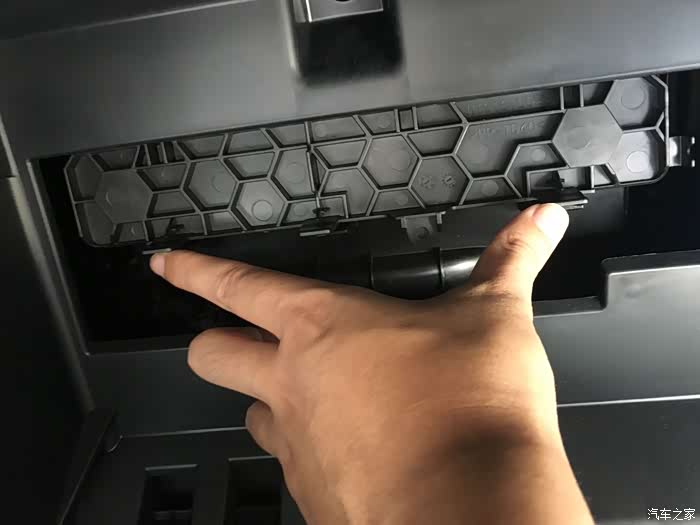 空调滤芯格档板下方有三个暗扣,手指所放位置和中间的一共三个慢慢的拨起,档板略微往上抬,三个暗扣脱离凹槽后自然就要卸出来了。
