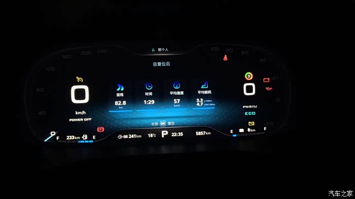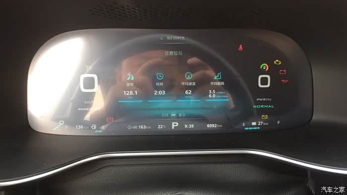 这是到家后国道的复位油耗电耗,3.3升4.7kwh每一百公里,可以算出总平均油耗3.8升每一百公里,平均电耗4.3kwh,总里程5857-5603=254公里,电续航60-8=52公里,油续航318-233=85公里,总续航下降137.可以看出来137续航跑出了254公里。