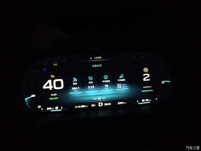这是跑完第一段高速的油耗电耗,4.3升和3.9千瓦时,平均速度76,电续航用掉21公里,油续航用掉75,总共96,公里,实际跑164,1公里
