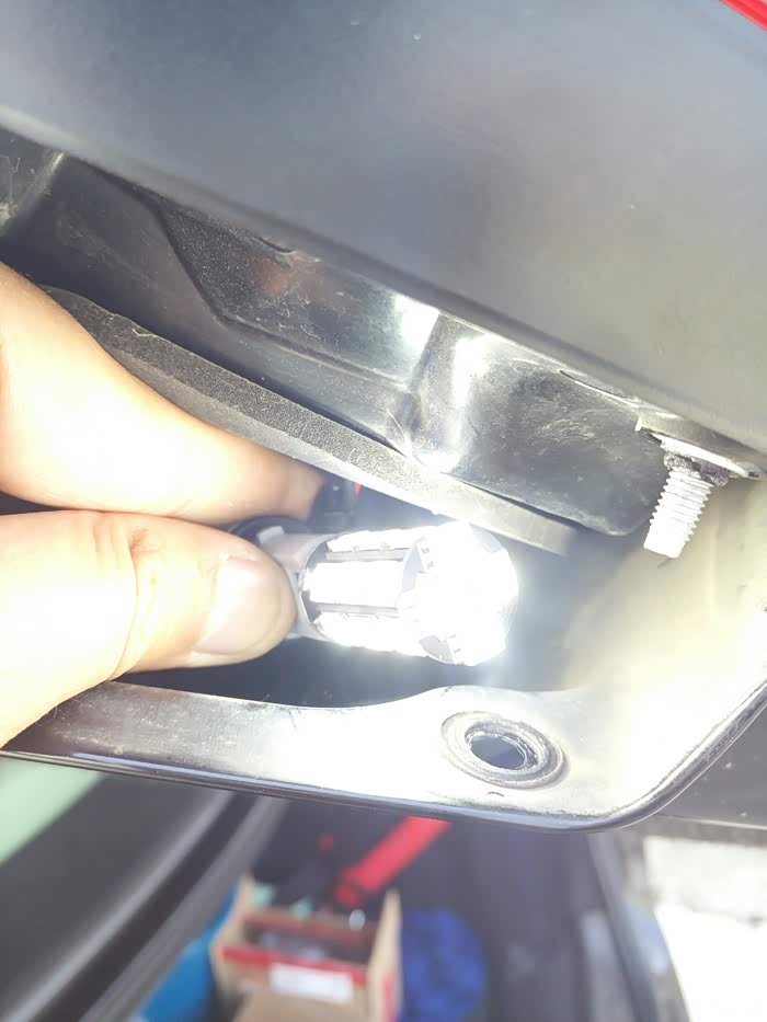 拿掉刹车灯总成,旋转灯泡底座取出原车灯泡