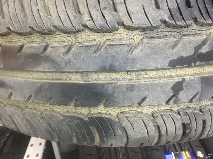 五年五万公里的轮胎,离磨损标志还有一定距离,但是轮胎裂纹已经相当严重。