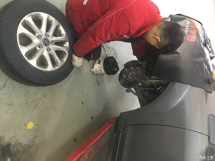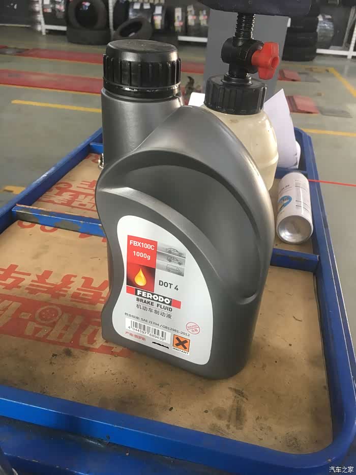 请原谅我,因为腰疼,仅拍了一张照片。汽修师傅先是将,空调进风口下的刹车油盖子打开,用图片中抽油的那个东西将刹车油进油处的一部分油抽出,然后像图片这样将抽油桶的吸管连接到每个轮子刹车泵后边的一个小口处,一边抽一边往刹车油进油处倒刹车油,四个轮子循环渐进。抽油桶后边连得是修车店吹气那个管子。这个过程比较漫长,耗时大概半个多小时。总共用了大概800~900g的样子。整个更换过程汽修师傅都非常耐心,要是混进空气后悔都来不及啊。