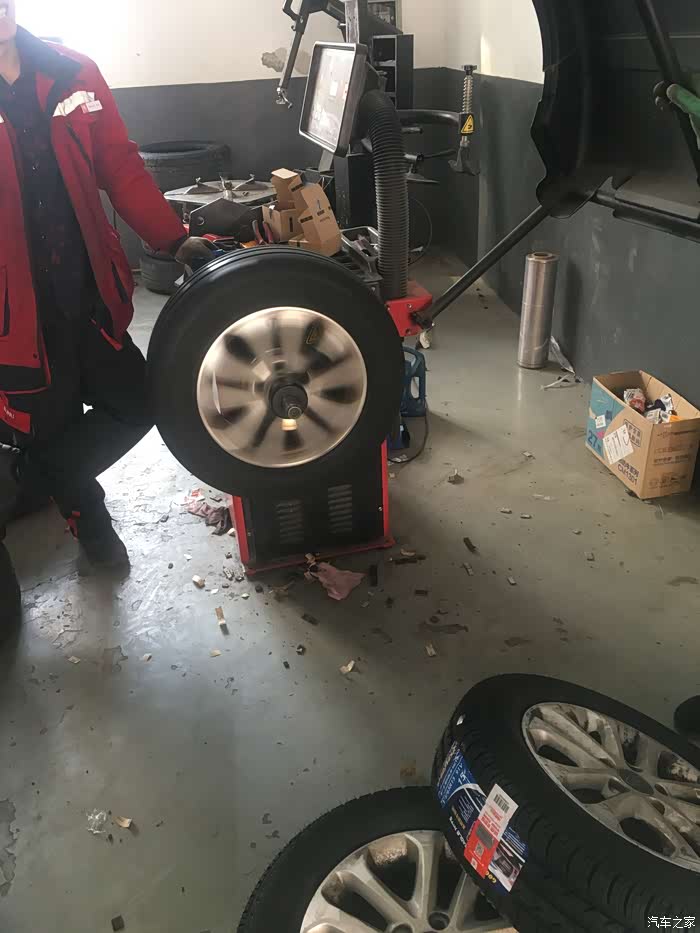 新轮胎都得做动平衡,这个不必多说,哪家店都是一样的,不过这次采用的是配重贴片。一个轮胎来来回回转了好几次,一边转一边一点一点起配重片。