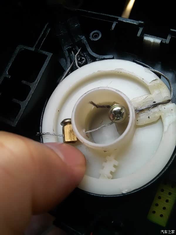 将埋好钢丝拉索的旋轮放入开关里,放置方向为旋轮的卡索槽对准红框右边的黑色外圆框的边缘。让白色的旋轮始终保持这个方向,慢慢的收紧钢丝拉索。