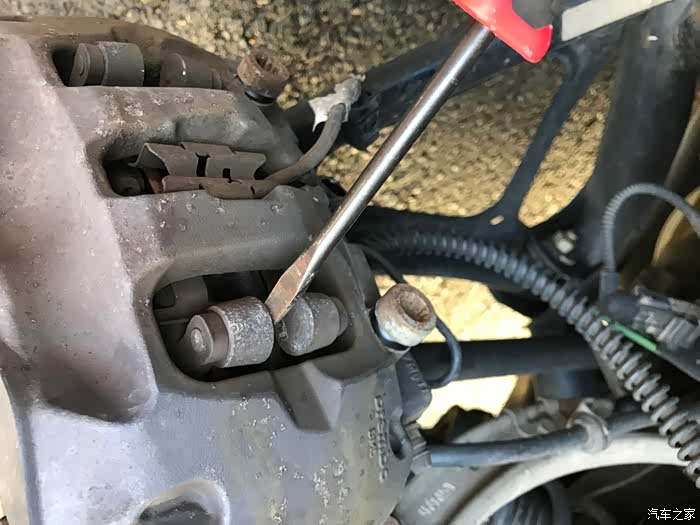 卡钳有一个固定弹簧,将旧刹车片往里顶,就可以将旧刹车片取出,其中一片连接着磨损传感器。本次我没有更换固定弹簧。