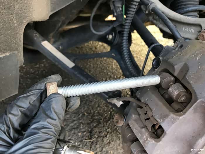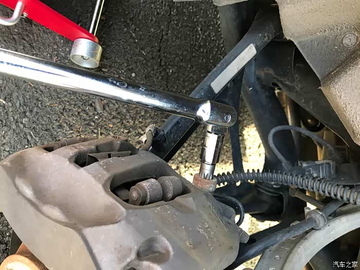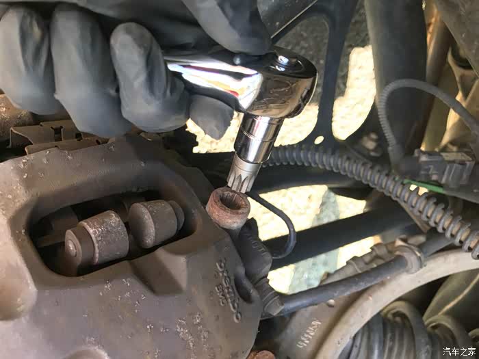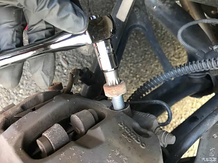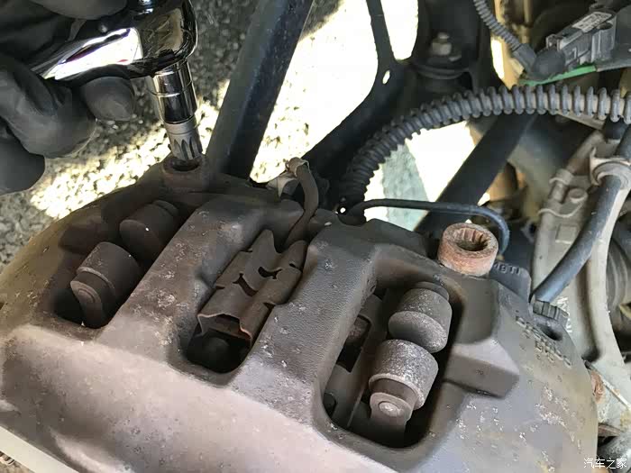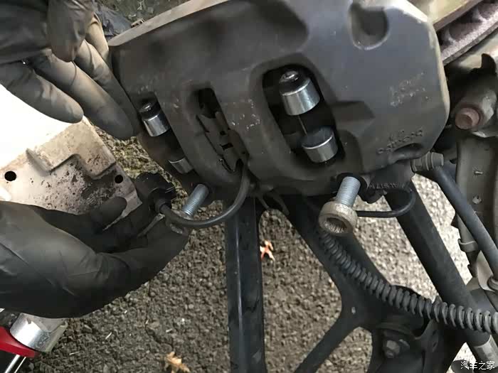 将卡钳的两颗固定螺丝,12角螺母小心拧开,注意用手托住卡钳,以免受重力影响破坏刹车油液管道(图中有一条管道,周围绕着橡胶保护圈圈的)