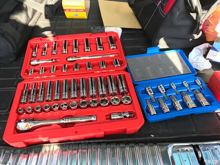 左边红色为 Tekton 3/8" 六角套筒 5/16-Inch - 3/4-Inch, 8 mm - 19 mm,深浅套筒都有,而且不会跳过某些尺寸,常备途锐后备箱,非常实用方便。 产地:中国台湾。