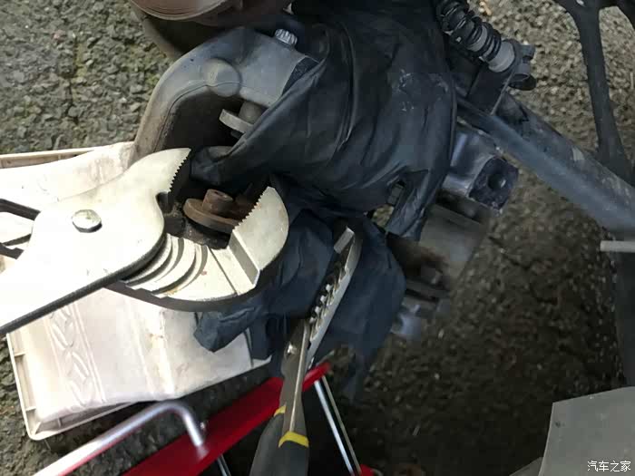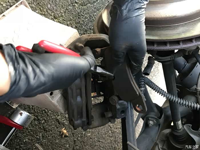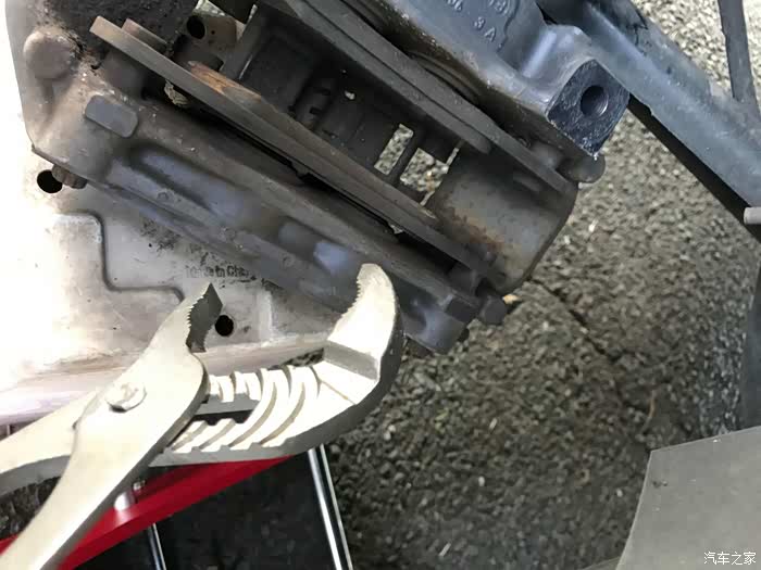 在花园找了个塑料花盘拖着卡钳,以便操作。因为没有专用的工具将活塞顶回去,因此土方法用宽口钳子(不确定这个工具名字),垫着旧刹车片和手套,将卡钳活塞推回,腾出空间给更厚的新刹车片。(推回时注意引擎舱的刹车油液是否过满溢出)