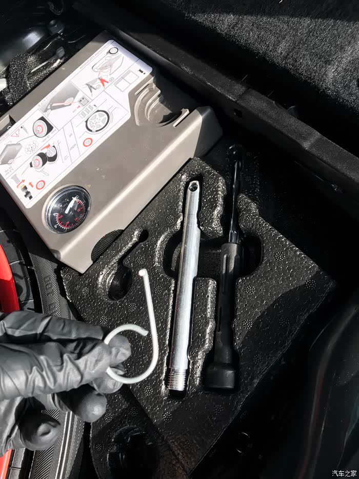 原车后备箱换备胎套件里面,有一个这样的银色小勾子,用于拆除轮毂上的六角螺母装饰盖。