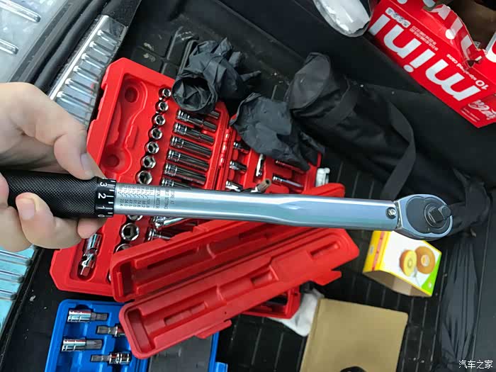 Tekton 3/8" 扭矩扳手,中国台湾制造。然后再将车轮装回,车轮固定螺母以画星型顺序扭紧,降低千斤顶后再用扭矩扳手将车轮固定六角螺母扭紧至 180N-m (130 ft-lb),具体车型扭矩请已汽车说明书为准。