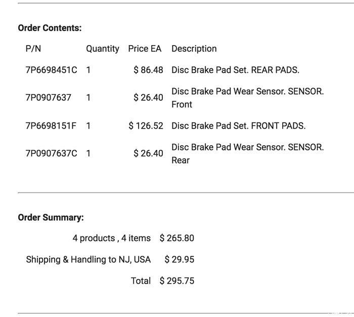 从折扣店Keffer Volkswagen的订单,含零件价格,当时是前后刹车片和磨损传感器一起买的。
