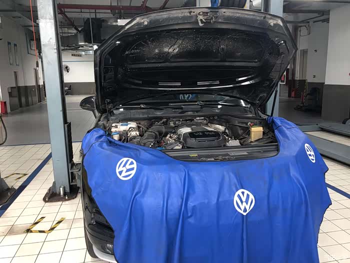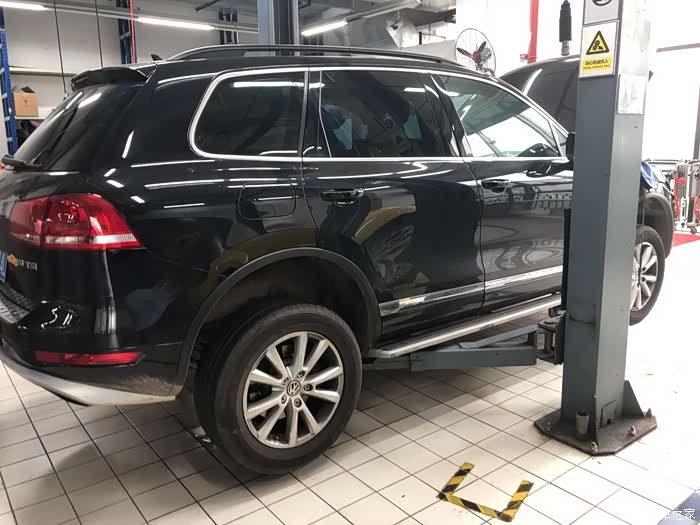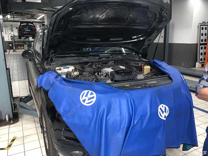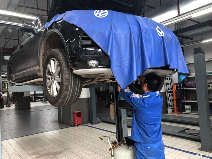 施工换机油的时候,师傅也给我的途锐披上“围巾”,防止刮花和弄脏车子,这些防护措施做得还是挺到位的。