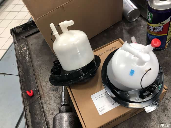 新老汽油滤对比,很明显看到左上角的老汽油滤变黄了不少,也许是吸附了不少油品里的残渣吧。