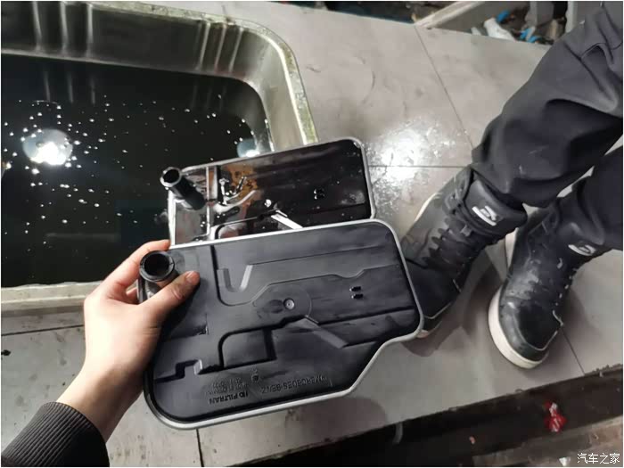 重点来了,变速箱油和滤芯的更换。这也是车子在小保养中没有的保养项目,6万公里最主要换的就是这些。奔驰C的变速箱滤芯和这个底壳是一体式的,整体更换