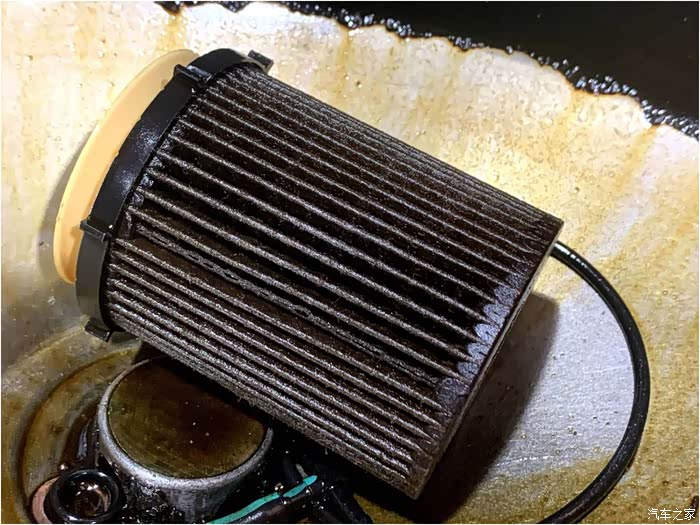 换下来的旧变滤,内部的过滤棉已经黑了。难怪换挡顿挫感越来越明显