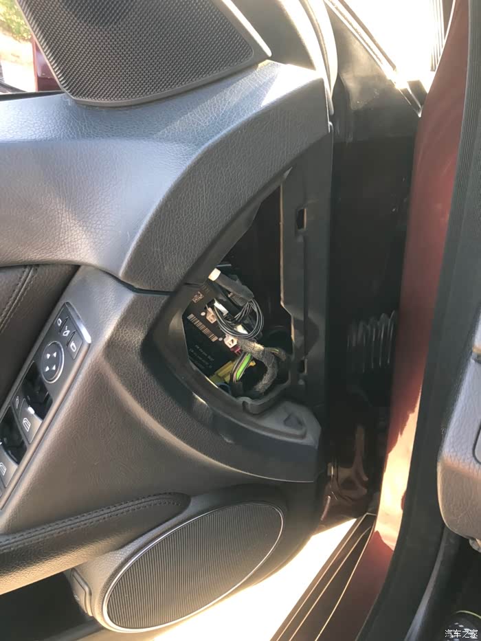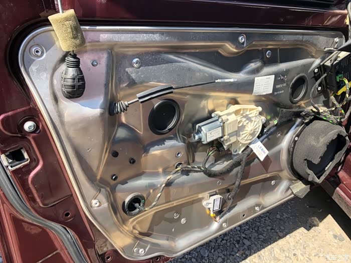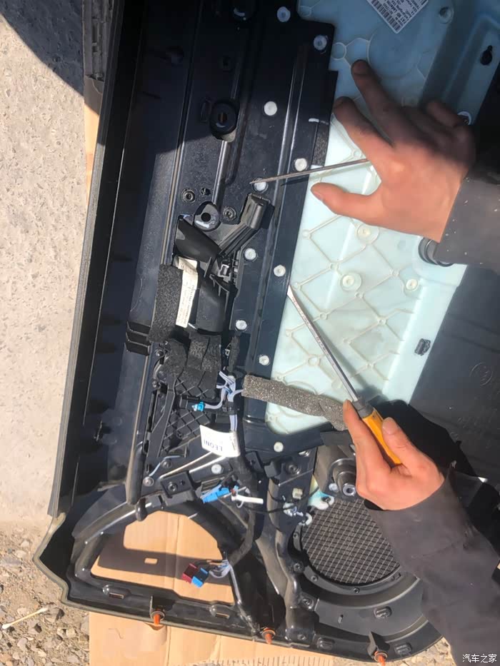 先把三角盖子拿下来,直接扣下来就行,接着门上面的小音箱也是直接扣下来,再把门框上的塑料框拆下来,这个必须全部拆下来,不然门板拿不下来。接着扶手下面两个螺丝用六角改锥拧下来,放好。接着用工具撬门板下面和两侧,全是卡扣,放心扣就行了,大力出奇迹。全部扣开后网上一提门板就下来了,把线拔掉。