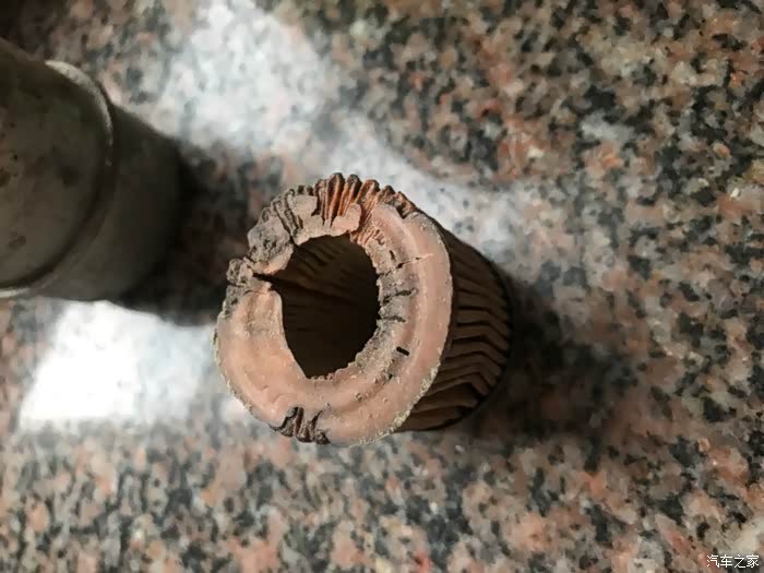 安上后大功告成,这次启动车后用肥皂水实验一点也不漏气,简直完美,开起来加速感觉也和以前没什么不一样,下面我们就来看看这旧滤芯,卸下来以后晃了晃,有声音,我估计是滤纸已经从滤芯壁上脱落了