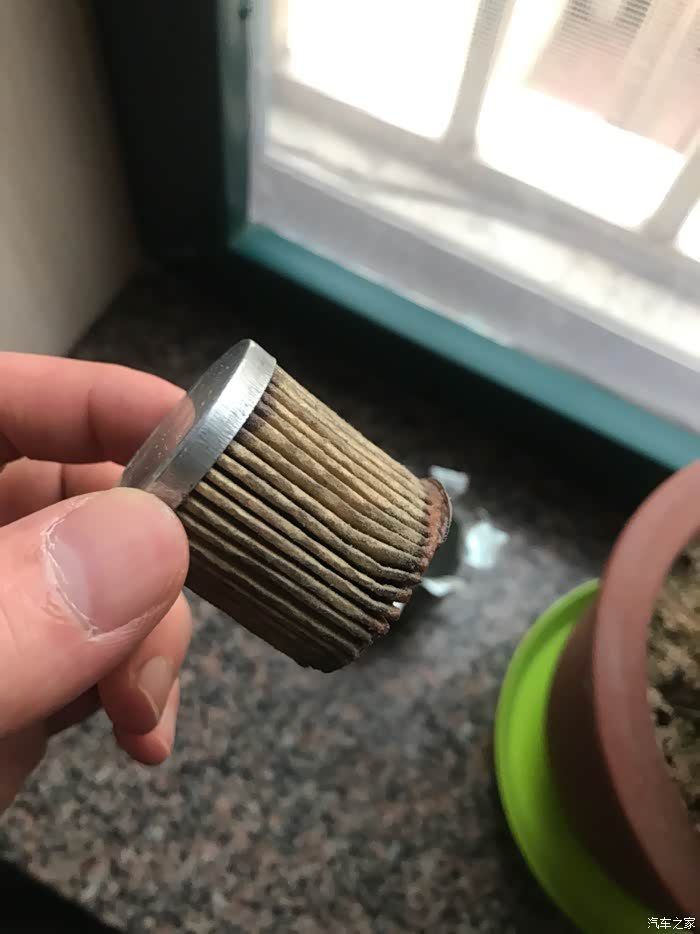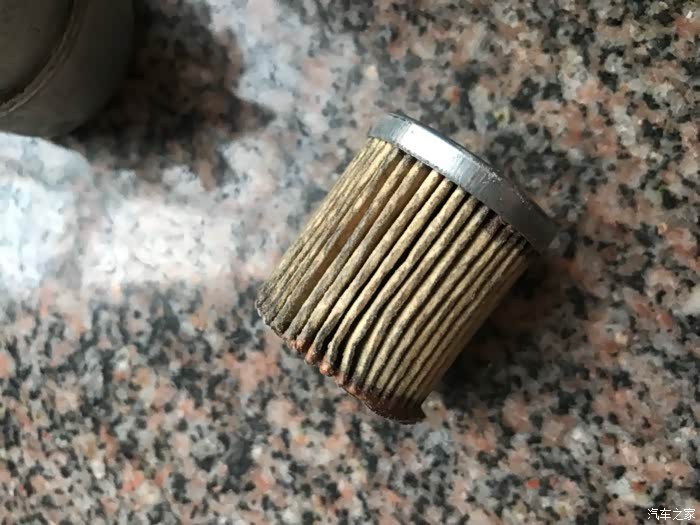由于长期不更换和流过高温燃气的关系,滤纸上的胶失效,滤纸已经从滤芯壁上脱落了,也就是说大量未经过滤的燃气可以由此进到气缸里,不知道这样的情况已经持续多久了,滤纸已经发黄,滤芯上有灰尘,虽然不算多,但也能影响发动机的寿命,幸好及时更换了,以后也一定得定时更换,这下可以安心开车了