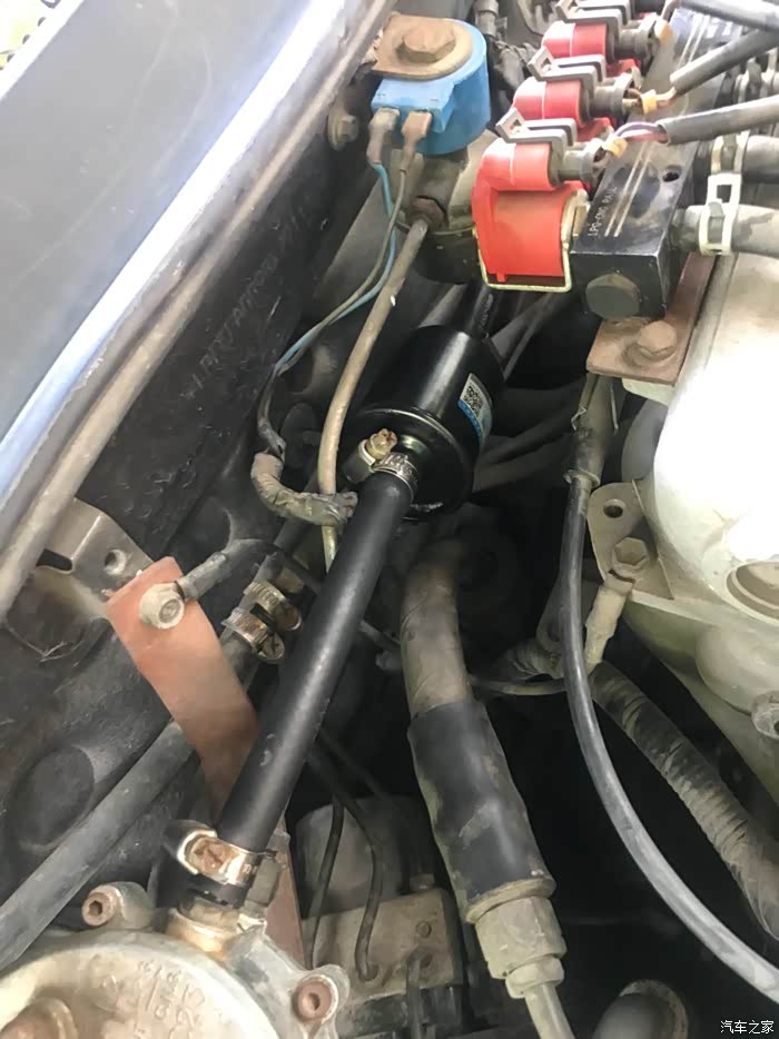 油改气车燃气滤芯非常好找,就在减压阀和喷轨之间的管路上,滤芯接口用螺丝卡箍固定,用螺丝刀就能卸下来,注意安的时候要用活扳手安紧点