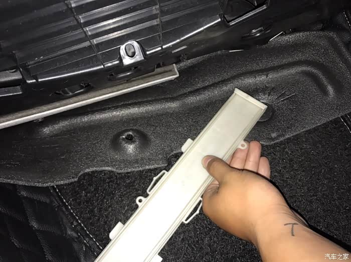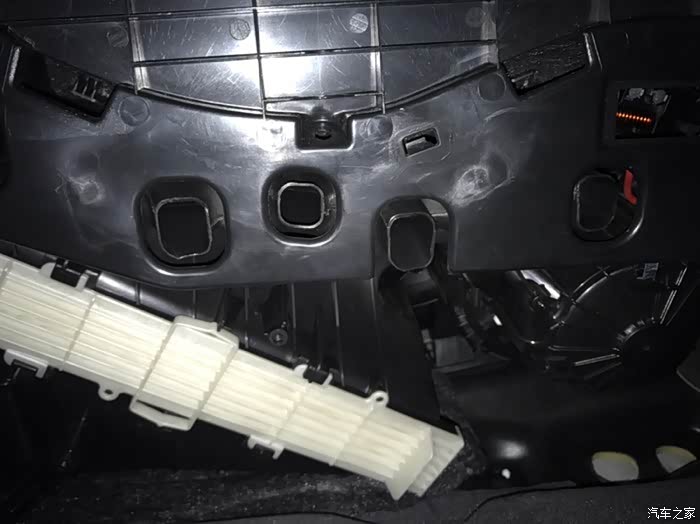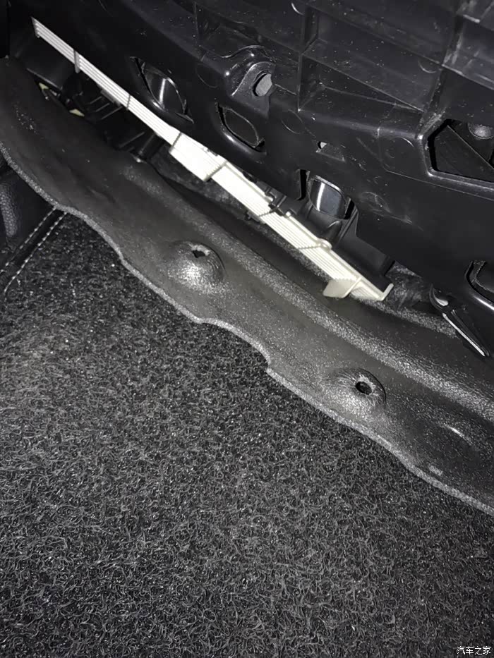 最后是内置空滤 需要副驾驶下面的泡沫板三颗螺丝拧开。这个操作不需要用到工具哦,然后你会看到一块白色的塑料。